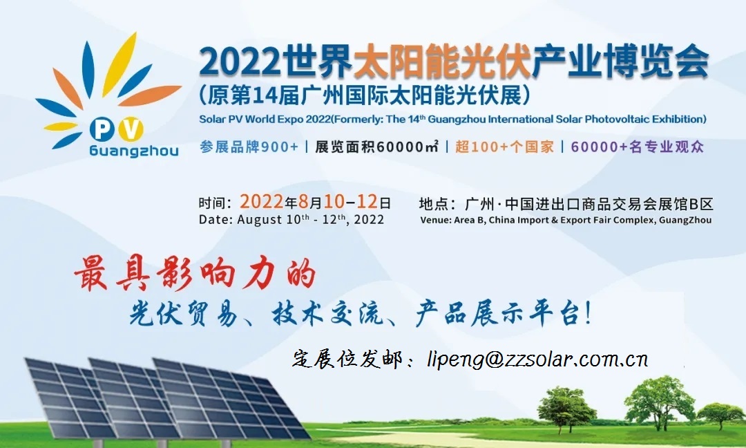 “2022世界太阳能光伏产业博览会(原第14届广州国际太阳能光伏展)”(PV Guangzhou)于 2022年8月 10日-12日在广州广交会展馆B区隆重举办!PV Guangzhou2022预计展商900多家,展览面积60000平方米,超100多个国家的60000多名专业观众。是国内外品牌拓展,中国市场的重要通道,是布局全球网络的最佳渠道,是光伏行业年度新品发布重要平台及贸易导向。