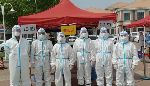 ”中建三局三公司马继鹏带队的“建证未来”青年志愿者小分队一大早就来到了位于天津市中新生态城建设者公寓的核酸检测采样岗亭,他是今天的小队长,将带领其他五位同事负责两个岗亭的咽拭子核酸检测采集工作。