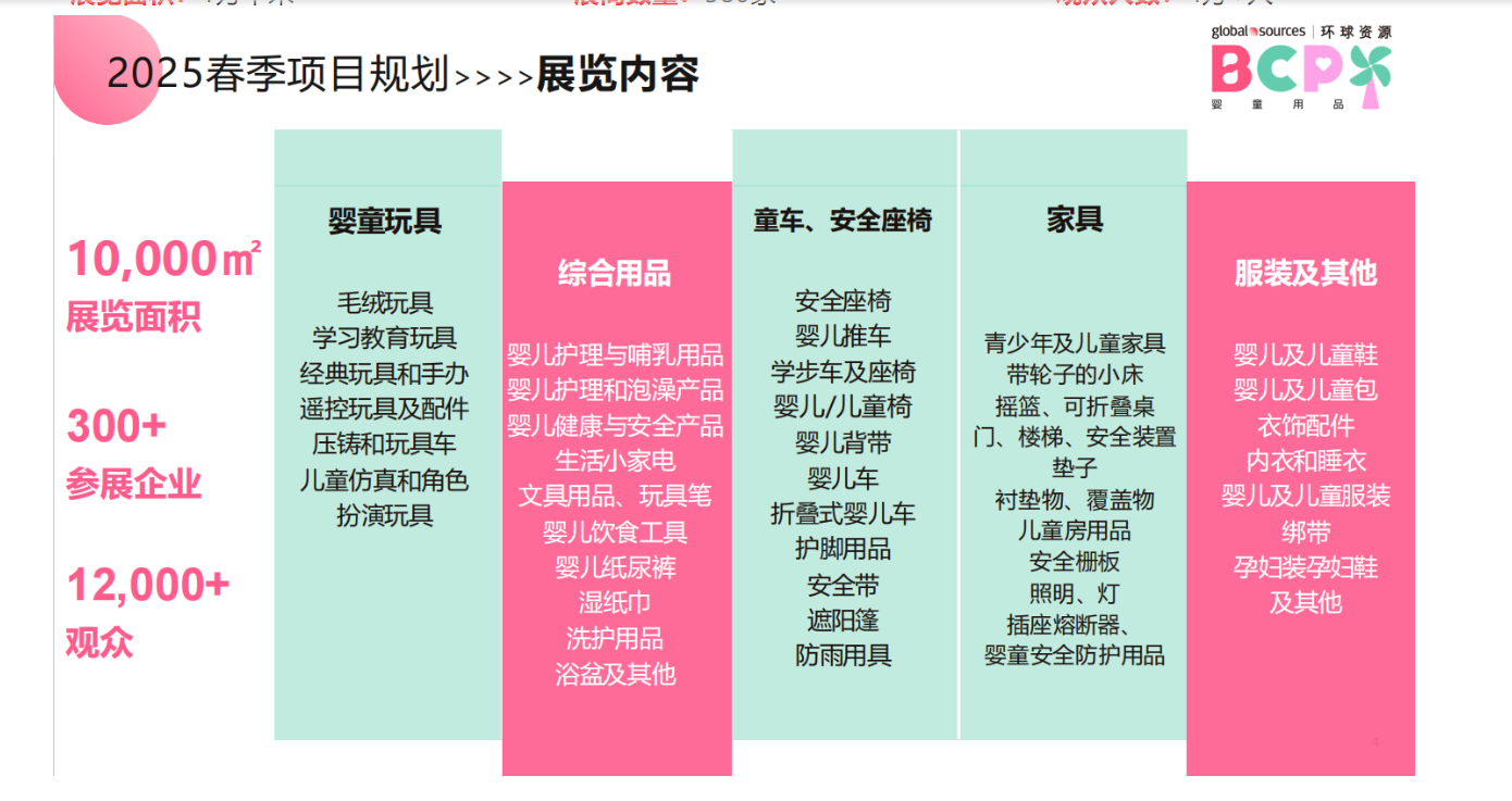 香港婴童用品展(BCP)是由环球资源主办的玩具及婴童用品贸易采购盛会,展会集中展示婴童玩具、婴童用品、婴童服装、推车及安全座椅、婴童家具等产品和服务,着力为中国玩具及婴童用品生产企业打造集商贸洽谈、国际交流及海外品牌推广为一体的专业采购对接平台 。随着近几年来中国人口出生率持续下降,国内市场需求萎缩;同时全球总人口数量持续增长,外贸需求仍在不断扩大的大背景下,环球资源将于2025年04月27日-30日在香港亚洲国际博览馆举办婴童用品展 。展会期间还将举办近千场次的1V1商贸配对会,实现参展企业展品及市场需求的精准对接 。
