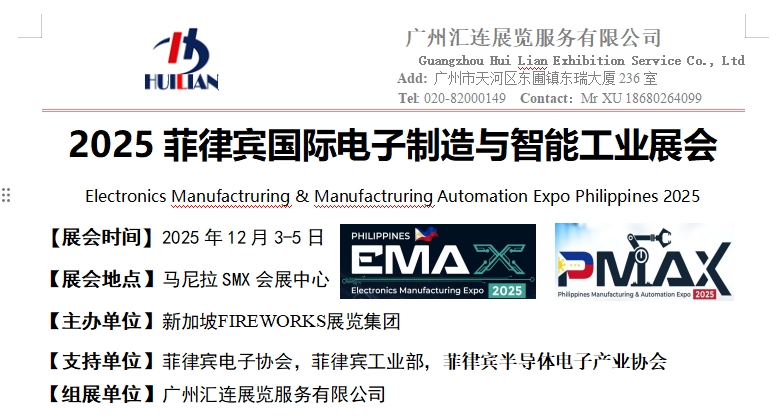 2025菲律宾国际电子制造与智能工业展览会作为菲律宾唯一的电子制造及智能工厂与工业自动化展会,与2025亚洲马来西亚电子制造展属于姊妹展,得到菲律宾电子协会,菲律宾工业部及新加坡电子协会的支持,他将芯片制造商,半导体制造商和设备供应商、电子元器件,生产设备等全产业链聚集在马尼拉。展示行业最先进步技术和设备,促进电子制造领域的合作和推动行业发展。